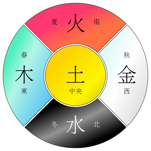 五行説では、万物は「木・火・土・金・水」の5種類の元素に分類され、方角や季節などすべての概念がそれぞれの要素に結び付けられている。