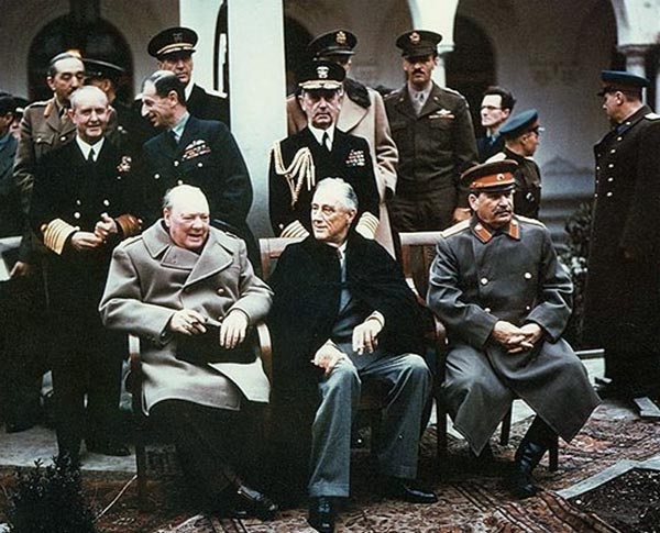写真は、1945年2月のヤルタ会談の様子。左から、イギリスのチャーチル首相、ルーズベルト大統領、ソ連の最高指導者スターリン。
