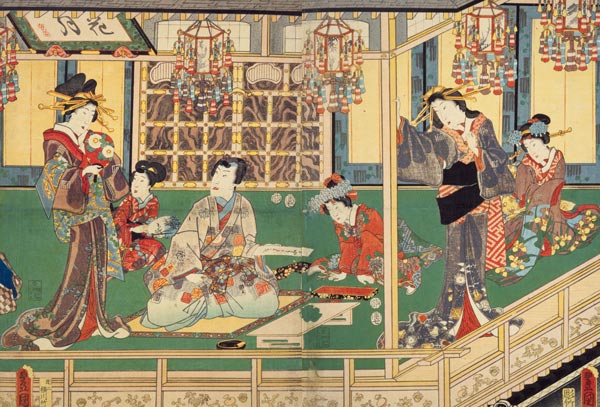 遊郭らしき場所で、季節は7月で七夕の準備をしているようだ。男性の左手には短冊、足元には硯(すずり)があり、机の上には里芋の葉のようなものが置かれている。
