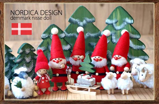 ニッセ(nisse)は、ノルウェーやデンマークで古くから伝えられている小柄な妖精。サンタのような赤い帽子をかぶり、ノルディックセーターやノルディック手袋を着こなして、大人のニッセから子供のニッセまで、男女様々なニッセが存在する。