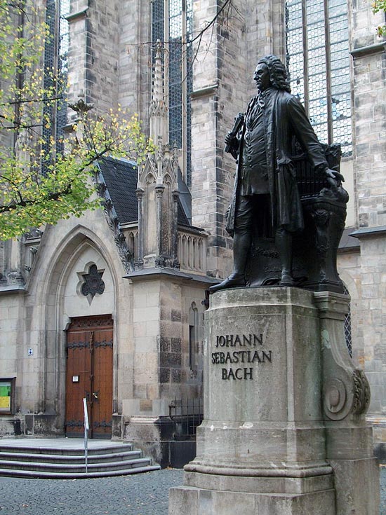 写真:バッハが後半生を過ごした聖トーマス教会(ライプツィヒ)前の銅像
