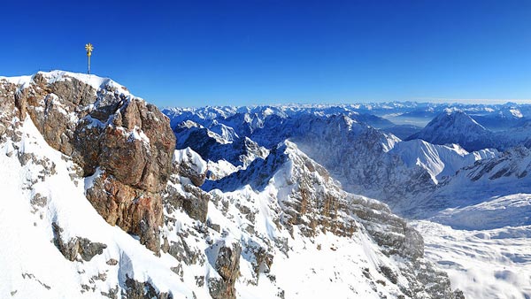 上写真はツークシュピッツェの眺め。高さ2,962mで、ドイツ・バイエルン州とオーストリア・チロル州の国境に位置する(山頂に検問所がある)。