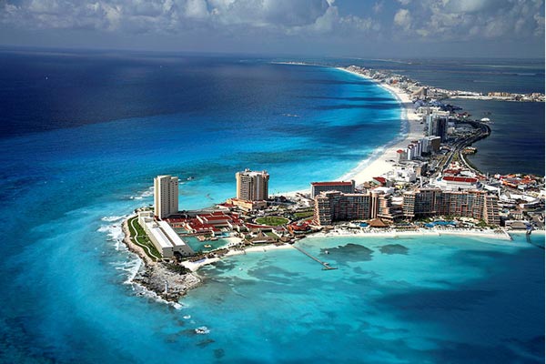 『波濤を越えて(Sobre las Olas)』は、メキシコの作曲家ローサスによる1884年出版のワルツ。写真はメキシコのリゾート地 カンクン・ビーチ。