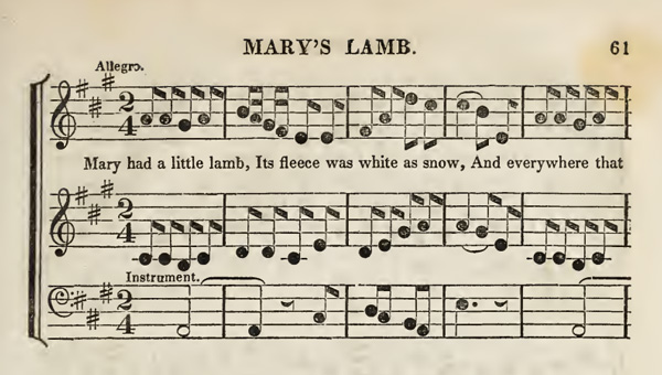 上の画像は、「少年少女の竪琴 Juvenile Lyre」67ページに掲載された童謡『メリーさんの羊』の1833年当時の楽譜の抜粋。原題は『Mary's Lamb』。
