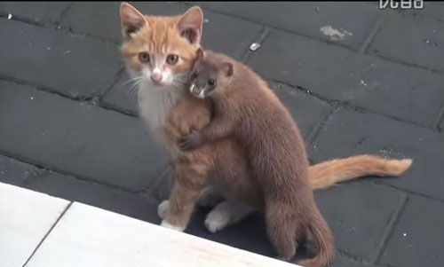 歌い出しの歌詞は「いたずらイタチが 裏の畑で ニワトリを見つけた」。下の写真はネコと仲良しのイタチ。