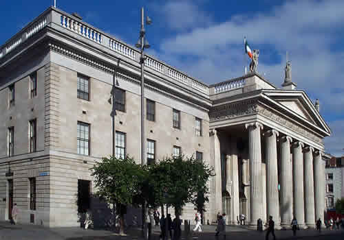 ダブリンの中央郵便局(GPO/General Post Office)(上写真)は占拠されて蜂起軍の総司令部となり、その屋上には今日のアイルランド国旗(三色旗)と、「アイルランド共和国」と書かれた緑の旗が掲げられ、共和国樹立宣言が読み上げられた。