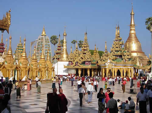 ミャンマー(ビルマ)のかつての首都ヤンゴン中心部に存在する寺院シュエダゴン・パゴダ(Shwedagon Pagoda)(上写真)。