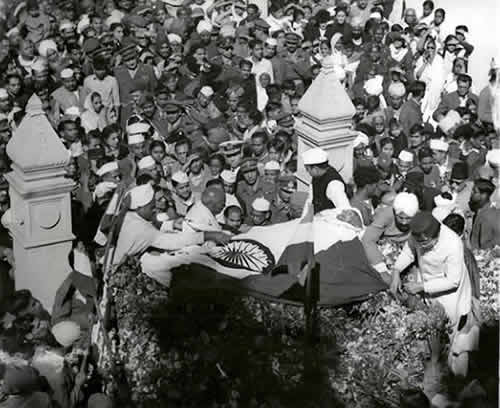 印パ戦争中の1948年1月30日、ニューデリーのビルラー邸で開かれた集会で、演台に向かっていたガンジーは、狂信的なヒンズー原理主義者によって3発の銃弾を撃ち込まれた。