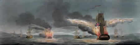 対するイギリス海軍は19隻の大艦隊。中でも、1804年に開発されたばかりのコングリーヴ・ロケット(Congreve rocket)を搭載した艦船HMSエレバス(HMS Erebus)は、3kmという長大な射程でマクヘンリー砦へロケットの集中砲火を浴びせた。