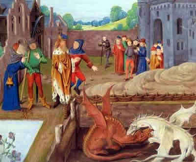 封印を解かれ再び争いを始める2匹の竜。一体これは何なのか魔術師マーリンに尋ねると、赤い竜はブリトン人(ケルト系先住民族)、白い竜はサクソン人(ヨーロッパから渡来)であり、「2匹の争いは赤い竜が白い竜を踏みつぶすまで終わらない」と予言めいた言葉を残した。後世になって、この予言は現実のものとなっていった。
