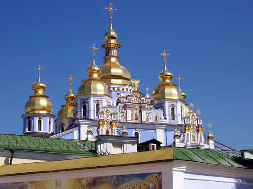 写真の建物は、ウクライナの首都キエフにある聖ミハイール黄金ドーム修道院。キエフ総主教庁ウクライナ正教会の修道院としてキエフの象徴となっている。