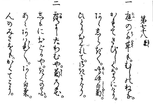 「しらぎく」については、直前の「さびしく」と韻を踏んでおり、仮名表記をそろえることで踏韻を見た目にも強調したものと推測される。