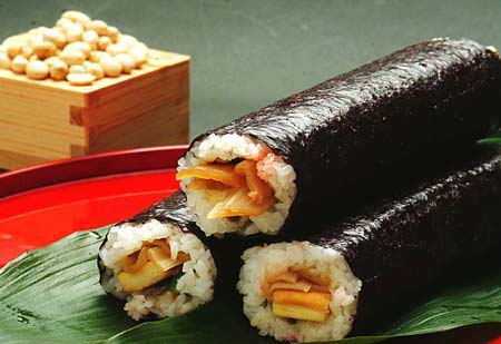 恵方巻きとは、節分の日に恵方を向きながら食べると縁起が良いという太巻き寿司のこと。以前は「丸かぶり寿司」などと呼ばれていたが、セブンイレブンにより1998年から「恵方巻」の名称で大々的にビジネス展開され、一般的な名称として定着していった。