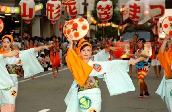 起源は諸説あるが、大正中期に尾花沢で土木作業時の調子あわせに歌われた土突き歌がルーツとされる。昭和初期に民謡化され、「花笠音頭」または「花笠踊り唄」として広まった(写真の出典:山形県観光協会Webサイト)。