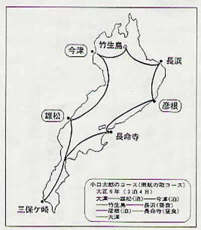 下の図は、作詞者の小口太郎が大正6年6月に実際にボートでたどった周航コース。琵琶湖周航は当時の京都大学の学生たちによる恒例行事となっていたという(参照:滋賀県高島市公式サイト)。