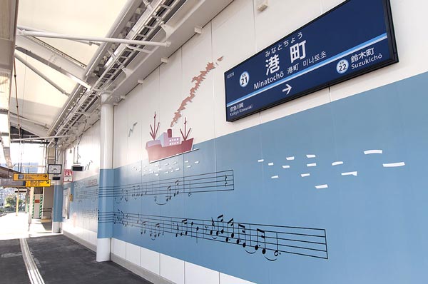 また、駅構内の各所には楽譜のデザインが取り入れられ、プラットフォームの壁面には『港町十三番地』の楽譜が描かれている。