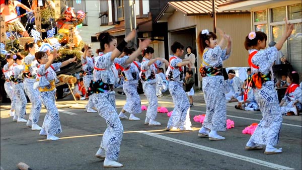 写真は平成23年に秋田県秋田市で開催された土崎神明社例祭(つちざきしんめいしゃさい)土崎港曳山(ひきやま)祭りでの『秋田音頭』の様子(出典:YouTube)。