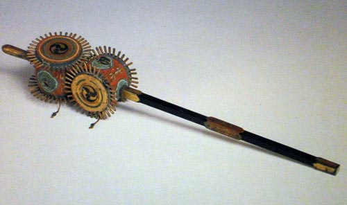 雅楽で用いられる「振鼓」(ふりつづみ)がモデルで、実際の雅楽では舞楽などで用いられる。写真:法隆寺編『法隆寺とシルクロード文化』(1989年)より。