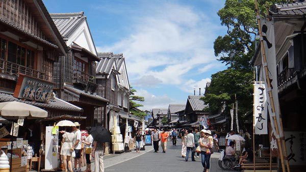 写真は伊勢神宮のおかげ横丁。数多くのみやげ物屋が建ち並ぶ。