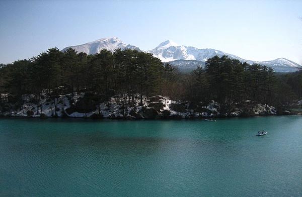写真は、五色沼の中で最も大きい毘沙門沼(出典:Wikipedia)。後に見えているのが磐梯山。五色沼周辺は磐梯朝日国立公園に指定されている。