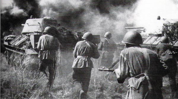 日本でも戦時ムードが高まるにつれ、唱歌などの楽曲はその時代を色濃く反映したものに変容していった(写真:ソビエト連邦の戦車T-34と赤軍兵士)。