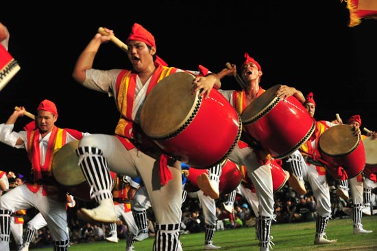 毎年8月に沖縄市で開催される県内最大のエイサーイベント『全島エイサー祭り』では、県内外から20万人の人々が訪れるという。上写真は平成25年度のトリを務めた沖縄市・越来(ごえく)青年会のエイサー(出典:たびらい・沖縄)。