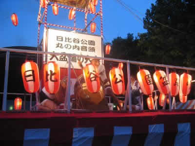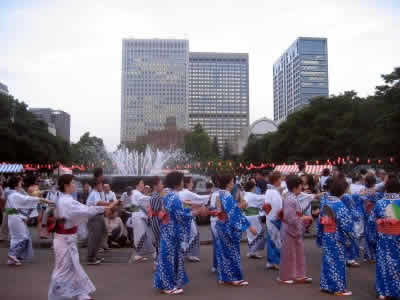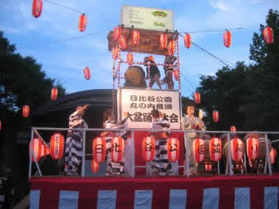 上写真は、日比谷公園で2005年8月に開催された「丸の内音頭 大盆踊り大会」(散策サイト「万歩計」より)。都心の高層ビルが周辺に立ち並ぶ夏の日比谷公園で、『東京音頭』のルーツとなった「丸の内音頭」をアピールした盆踊り大会が毎年開催されている。