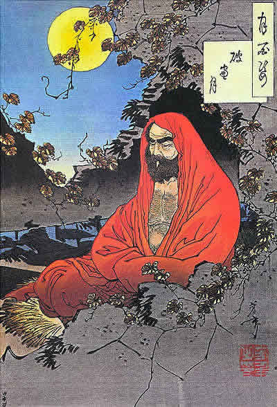 洛陽郊外の嵩山(すうざん)少林寺において、壁に向かって座禅を続け、9年間も続いたその偉業は「面壁九年(めんぺきくねん)」の伝説として後世まで語り継がれている。