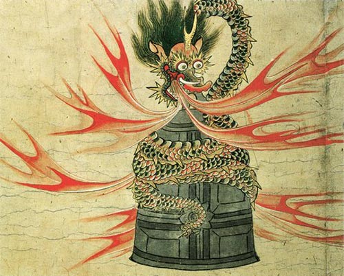 あまりに酷い仕打ちに清姫の怒りは天を衝き、火を吐く大蛇に化けて安珍を追跡。道成寺に逃げ込んだ安珍を追いつめた。