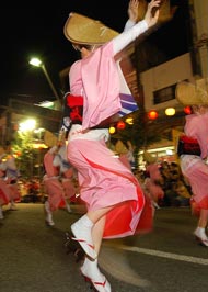 徳島県発祥の盆踊り「阿波おどり」では、踊り手の集団が踊り歩く際に囃子ことばが歌い込まれる。