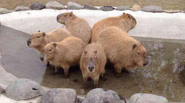 写真:おしくらまんじゅう状態のカピバラ達(阿蘇ファームランド ふれあい動物王国 Twitterより/実はトイレ中)