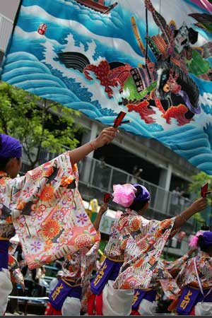 毎年8月に高知県高知市で開催される「よさこい祭り」。様々にアレンジされた楽曲『よさこい鳴子踊り』に合わせて、よさこい鳴子を振り鳴らしながら、それぞれのチームが趣向を凝らした振り付けや衣装で踊りを披露していく。