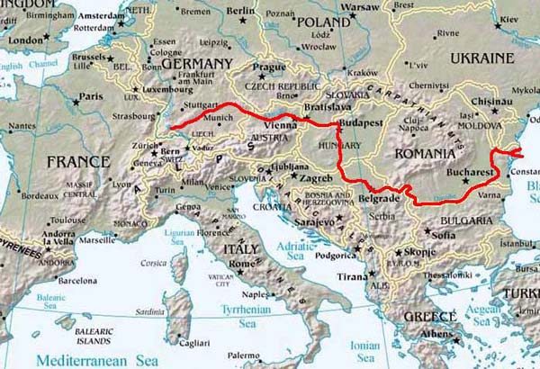 上のヨーロッパ地図の赤い線がドナウ川。地図右上の「UKRAINE」がウクライナを示す。