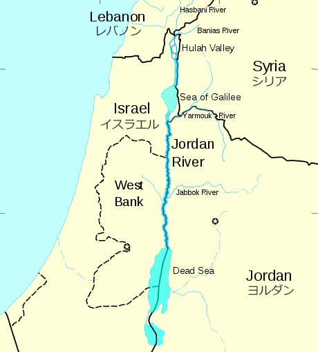 下の地図で、中央上から下へ国境線上を縦断する青い部分がヨルダン川(Jordan River)。ヨルダン川の西側に「West Bank」と記述された点線の地域は、いわゆる「ヨルダン川西岸地区」。イスラエル入植地とパレスチナ自治区が錯綜しており、国際ニュースなどで「パレスチナ問題」として報道される紛争地域となっている。