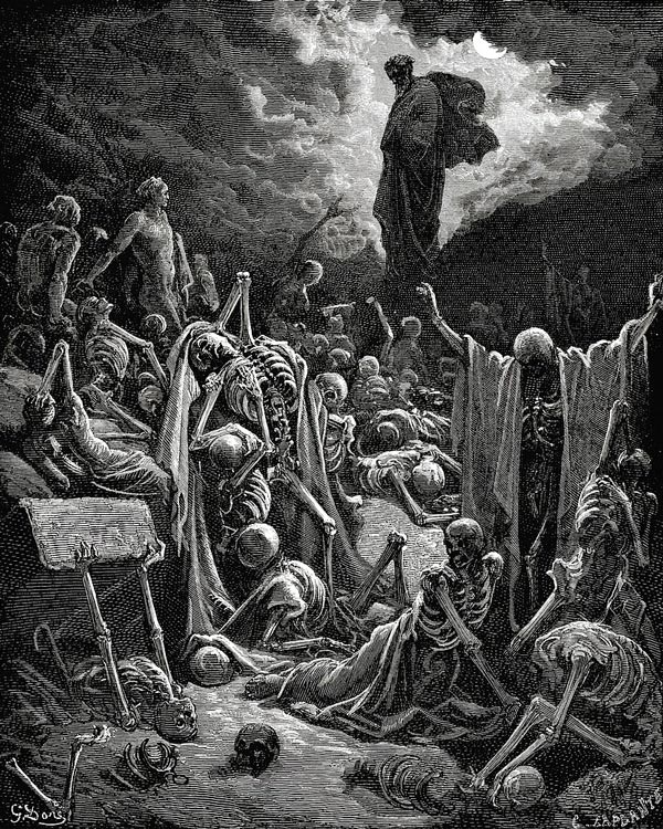 上の挿絵は、19世紀フランス人画家ギュスターヴ・ドレ(Paul Gustave Doré/1832–1883)が描いた「乾いた骨の谷の幻視(エゼキエルの幻視)」。
