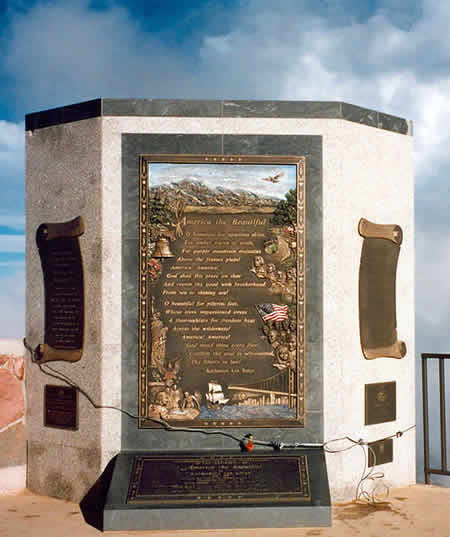なお、ベイツが登ったパイクス・ピーク(Pikes Peak)山頂には、彼女が作詞したアメリカ第2の国歌『America the Beautiful』誕生を記念すべく立派な歌碑が建立されている(上画像:出典 Wikipedia)。