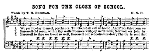 上の楽譜画像は、発見された『Song for the Close of School』のもの。作詞者としてT.H.ブロスナン(T.H. Brosnan)、作曲者は「H.N.D」と記載されている。