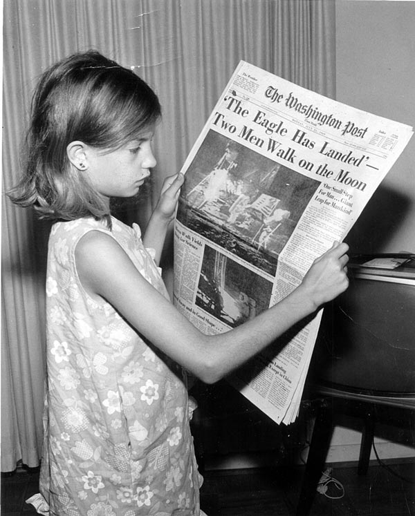 写真:1969年7月のワシントンポスト誌上でアポロ11号の月面着陸ニュース記事を読む少女(出典:Wikipedia)